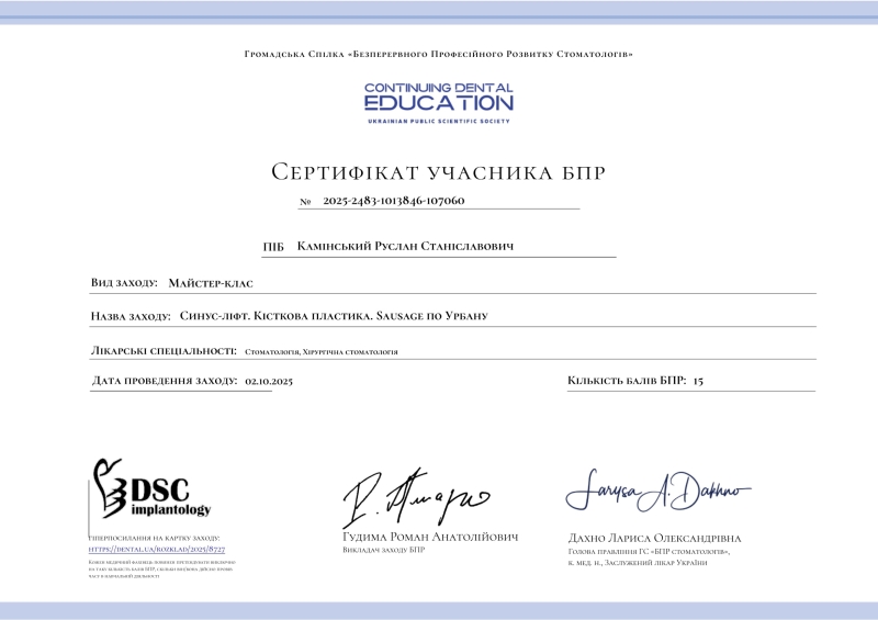 - Майстер-клас: «Синус-ліфт. Кісткова пластика. Sausage по Урбану», 2025