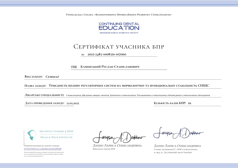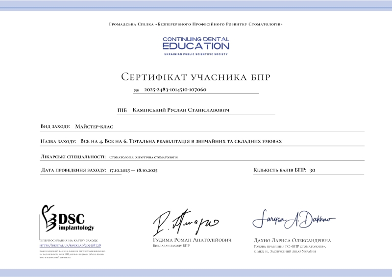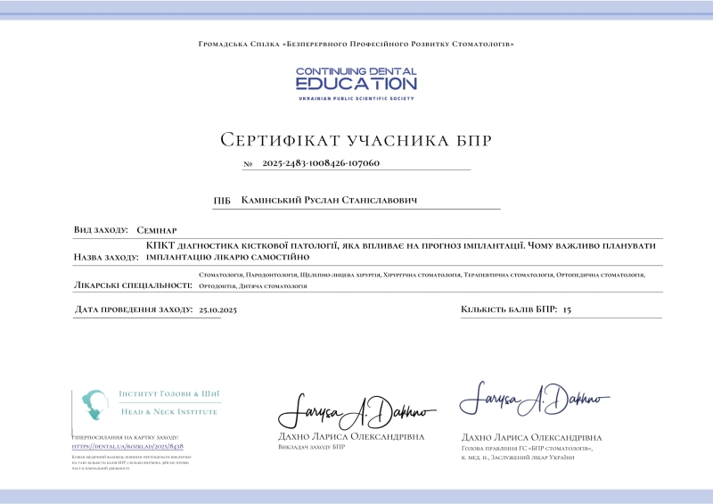 - Семінар: «КПКТ діагностика кісткової патології, яка впливає на прогноз імплантації. Чому важливо планувати імплантацію лікарю самостійно», 2025