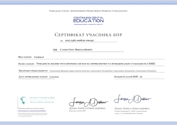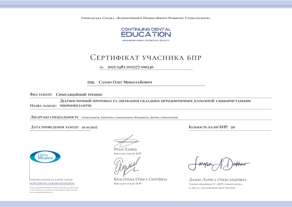 - Симуляційний тренінг: «Діагностичний протокол та лікування складних ортодонтичних патологій з використанням мікроімплантів», 2025