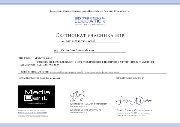 - Майстер-клас: «Розширення верхньої щелепи у дорослих пацієнтів в поєднанні з хірургічним послабленням піднебінного шва», 2025